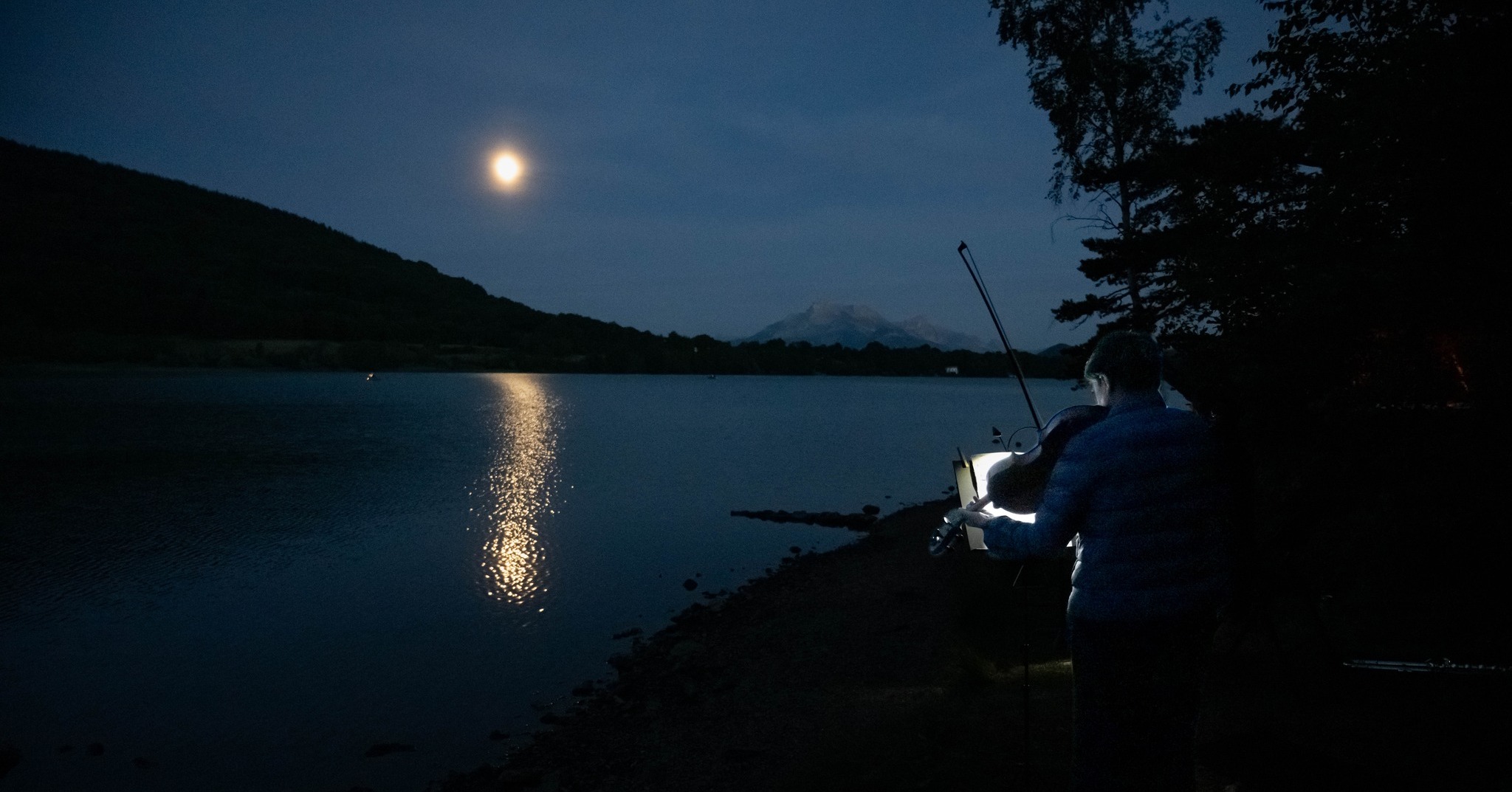 La musique joue donc ici son rôle de médiatrice dans notre connexion à l’espace sonore où nous allons assister à la disparition de la lumière. Il y a une répartition orchestrale classique, mais éclatée : la spatialisation a été imaginée spécifiquement à travers la topographie autour du lac de Pétichet. L’espace devient ainsi le premier paramètre que nous percevons de cette musique, et cela nous fragilise.