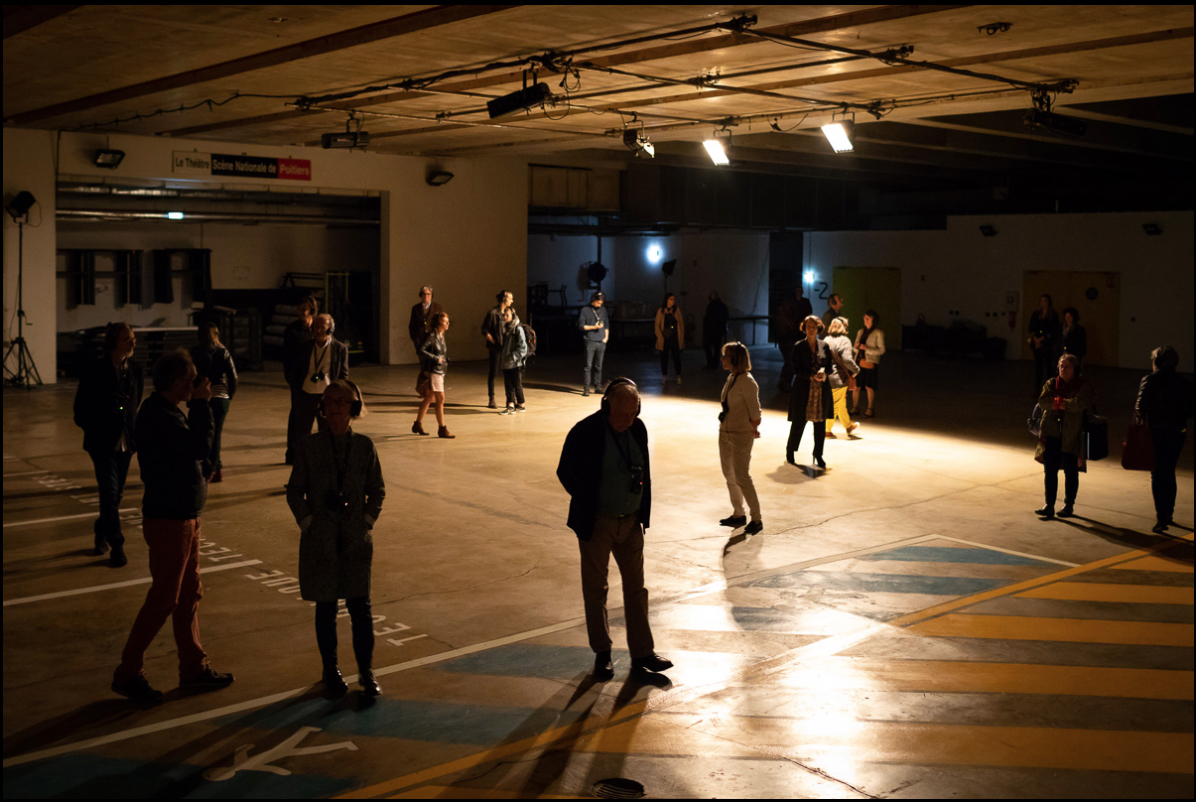 Ainsi pour cette pièce d’un format nouveau, le public est invité à apprécier la musique dans deux espaces superposés : celui d'un espace du Théâtre Auditorium de Poitiers, qui résonne très concrètement de percussions et d'une contrebasse, et d'un autre monde sonore, virtuel, accessible par les casques : le dispositif des casques fonctionne comme un portail vers un univers parallèle…